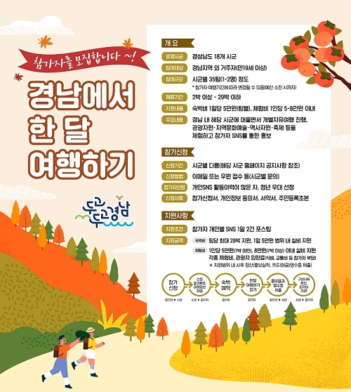 '경남에서 한 달 여행하기'는 경남도와 18개 시군이 지역 내 체류 여행 경비를 지원해 관광객이 오랜 기간 경남에 머무를 수 있도록 여유로운 여행 분위기를 조성하고 경남 관광을 홍보하기 위한 사업이다.