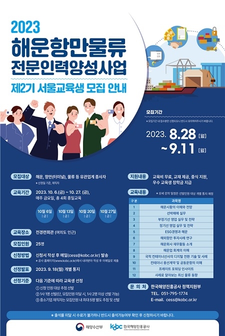 한국해양진흥공사가 다음달 11일까지 ‘2023년 해운항만물류전문인력양성사업’ 제2기 교육생을 모집한다고 밝혔다.