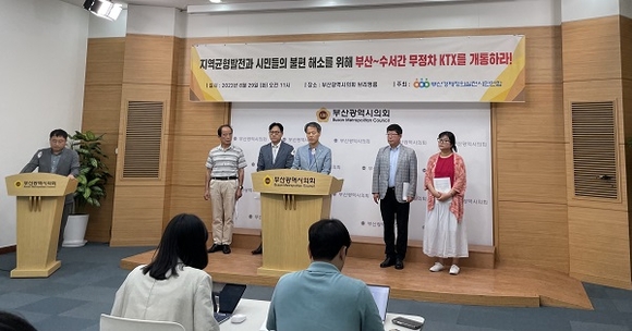부산경제정의실천시민연합은 29일 오전 부산시의회 브리핑룸에서 기자회견을 열고 “지역균형발전과 시민 불편 해소를 위해 부산∼수서간 무정차 KTX를 개통하라”고 요구했다.