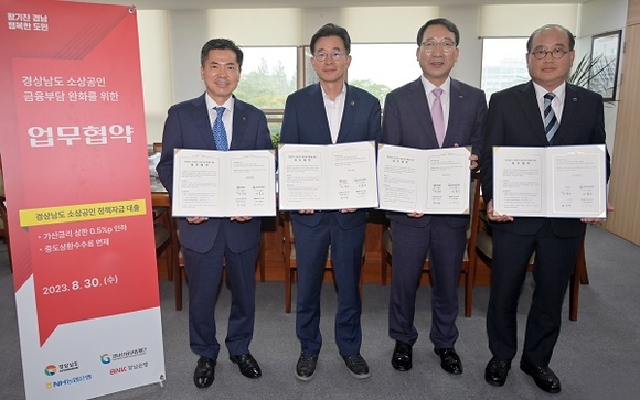 경남도는 30일 오전 도청에서 NH농협은행, BNK경남은행, 경남신용보증재단과 함께 '경상남도 소상공인 금융 부담 완화를 위한 업무협약'을 체결했다.
