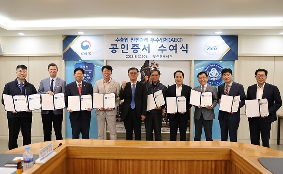 부산본부세관이 30일 수출입 안전관리 우수업체(AEO) 공인증서 수여식을 개최해 관세청의 심의를 거쳐 공인을 획득한 현대글로비스 주식회사 등 10개 기업에 AEO공인증서를 수여했다.