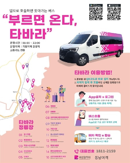 부산시가 다음달 1일 오전 10시 기장군 동해선 오시리아역에서 부산형 수요응답형(DRT) 버스 '타바라' 개통식을 개최한다고 밝혔다.