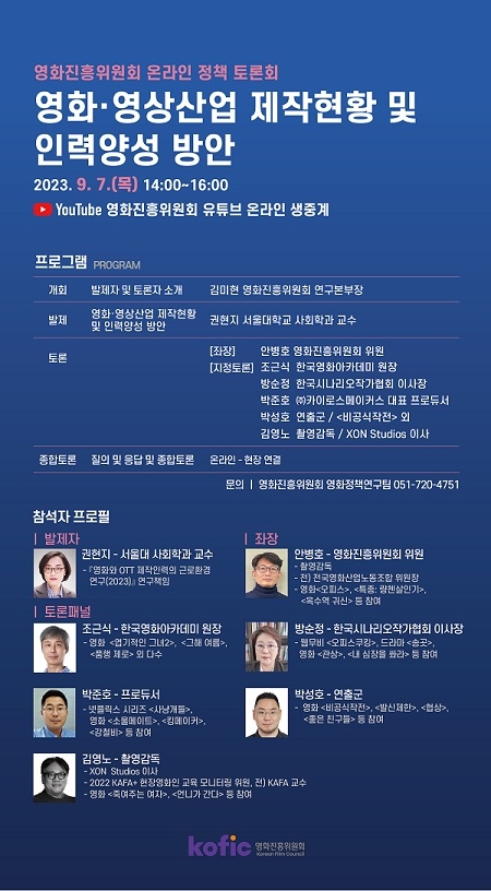 토론자로는 ▲조근식 한국영화아카데미 원장, ▲방순정 한국시나리오작가협회 이사장, ▲박준호 프로듀서(<강철비> 외), ▲ 박성호 연출군(<비공식작전> 외), ▲김영노 촬영감독 등이 참여하여 영화·영상 확장 환경에서의 주요 직무별 노동 시장의 변화에 대해 깊이 논의한다.
