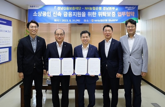 NH농협은행 경남본부는 도내 중소기업·소상공인에 대한 신속한 금융지원을 위해 31일 경남신용보증재단과 '보증업무 위탁에 관한 협약'을 체결하고 오는 9월 1일부터 위탁보증을 실시한다고 밝혔다.