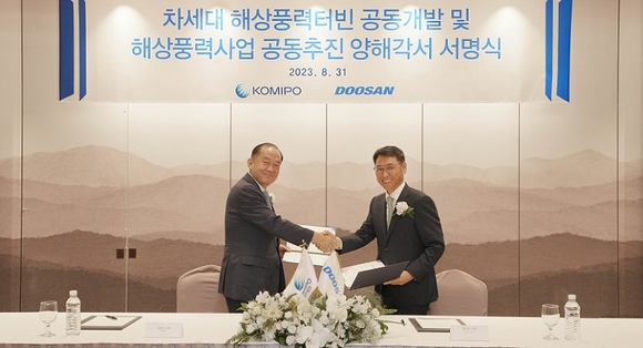 두산에너빌리티가 한국중부발전과 차세대 해상풍력 공동개발 및 해상풍력사업 추진을 위한 양해각서를 체결했다고 31일 밝혔다. 이날 열린 서명식에는 한국중부발전 김호빈 사장과 두산에너빌리티 정연인 사장 등 양사 관계자들이 참석했다.
