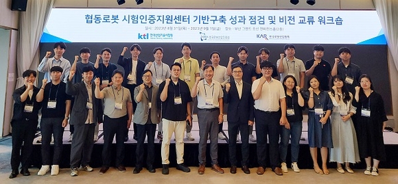 한국산업기술시험원은 한국로봇산업진흥원, 한국로봇산업협회와 함께 협동로봇 시험인증 지원센터 구축 및 운영을 위한 비전 교류 워크숍을 한 후 단체 기념촬영을 했다. (사진=KTL 제공)