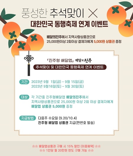 경남 진주시는 1일부터 15일까지, 16일부터 30일까지 2회에 걸쳐 대한민국 동행축제와 연계한 추석맞이 '배달의 진주' 이벤트를 진행한다고 밝혔다.