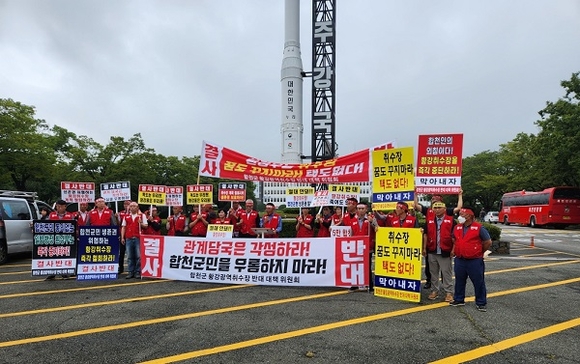 황강광역취수장 관련 군민대책위원회는 1일 대책위원과 합천군의원 50여명은 경남도청 정문 앞에서 취수장 설치사업 중단 반대집회를 연 뒤 황강 광역취수장 합천지역 용역 제외 요구와 합천군 취수장 설치 반대 의견을 전달하기 위해서 도청을 항의 방문했다.
