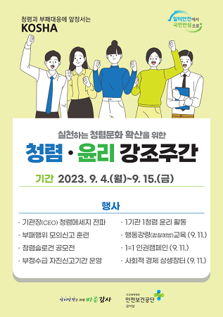 안전보건공단은 4일부터 15일까지 2주간 임직원의 청렴의식 환기 및 실천하는 청렴문화 확산을 위해 '청렴·윤리 강조주간'을 운영한다.