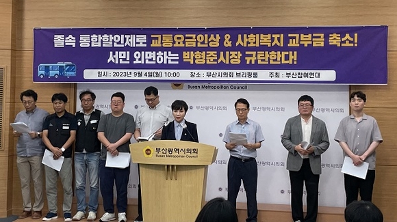 부산참여연대는 4일 오전 부산시의회 브리핑룸에서 “졸속 통합할인제로 교통 요금 인상과 사회복지 교부금 축소로 인해 서민을 외면하는 박형준 부산시장을 규탄한다”고 밝혔다.