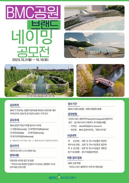 부산도시공사가 도심 속 공원을 대표하고 공사가 지향하는 공원의 가치를 담은 브랜드 개발을 위해 ‘BMC 공원 브랜드 네이밍 공모전’을 개최한다고 4일 밝혔다.