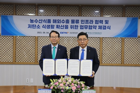 부산항만공사(BPA)가 4일 한국농수산식품유통공사(aT)와 한국 농수산식품 수출 경쟁력 강화 및 해외 물류인프라 협력을 위한 업무 협약을 체결했다.
