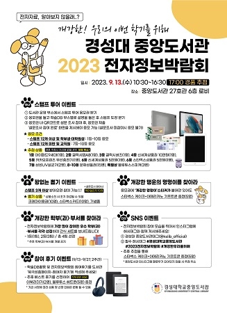 경성대학교 중앙도서관에서는 오는 13일 10시 30분부터 오후 4시 30분까지 중앙도서관 6층 로비에서 중앙도서관 전자자료 이용 활성화를 위한 '2023 중앙도서관 오프라인 전자정보박람회'를 실시한다.