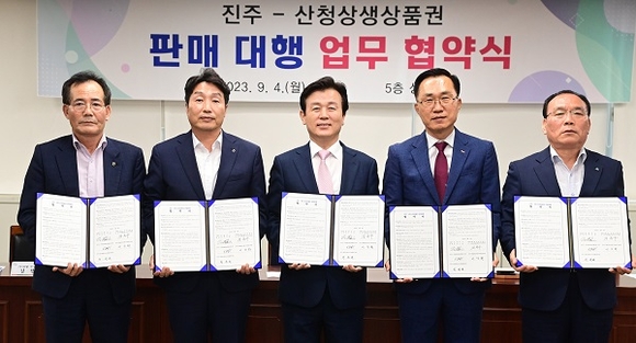 경남 진주시는 4일 시청 상황실에서 산청군과 공동 발행하는 '진주-산청 상생상품권'의 원활한 유통을 위해 NH농협은행, 진주시 지역농협조합, BNK경남은행, MG새마을금고 등 4개 금융기관과 판매대행 협약을 체결했다.