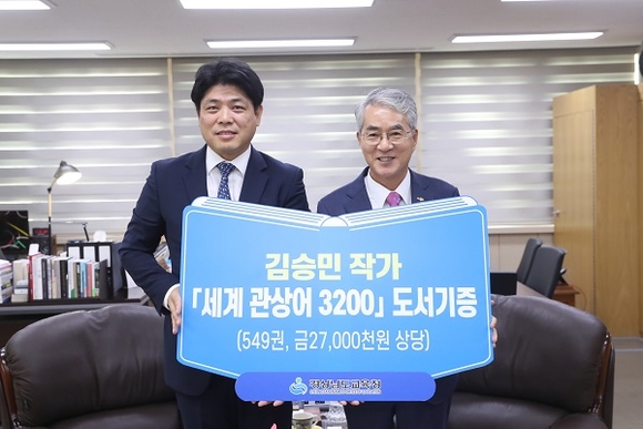 경남도교육청이 6일 김승민 작가로부터 2700만 원 상당의 <세계 관상어 3200> 549권을 기증받았다.