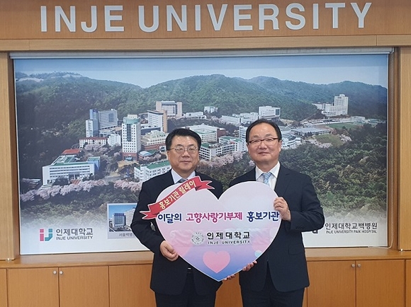 경남 김해시는 6일 인제대학교 총장실에서 고향사랑기부제 홍보기관 릴레이 피켓을 '김해시도시개발공사'에서 다음 홍보기관인 '인제대'로 전달했다.
