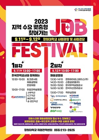 창원대학교는 대학생들과 지역 청년 구직자들에게 취업정보 제공을 위한 소통의 장을 마련하기 위해 오는 11일, 12일 이틀간 창원대 제2학생회관 및 사림광장에서 '2023년 지역 수요 맞춤형 찾아가는 Job Festival(잡 페스티벌)'을 개최한다고 8일 밝혔다.