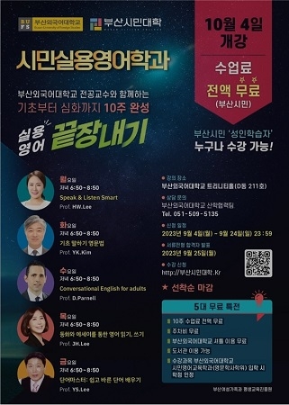 부산외국어대학교는 지난달 31일 부산여성가족과 평생교육진흥원의 '부산시민대학 캠퍼스 운영' 사업을 통해 대학 내 '시민실용영어학과' 프로그램을 개설하고 부산시 성인학습자를 대상으로 영어학습 기회를 무료로 제공한다고 11일 밝혔다.