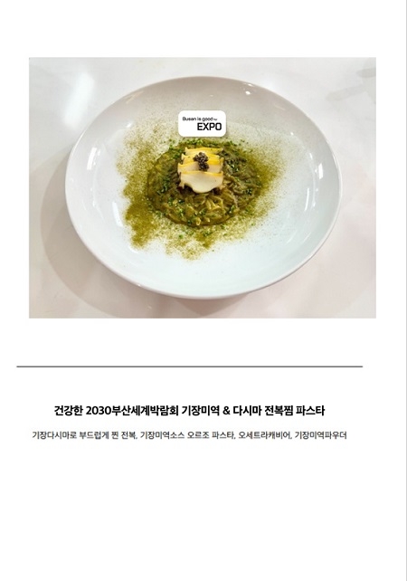 이어 ‘건강한 2030부산세계박람회’는 기장 다시마로 부드럽게 찐 전복과 기장 미역이 들어간 오르조 파스타로 구성돼 부산의 건강한 식재료를 표현했다.