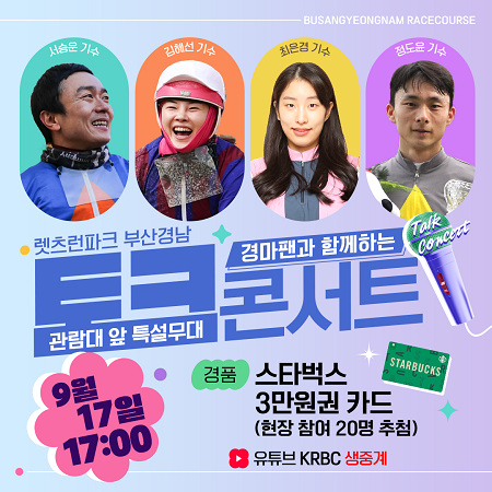 렛츠런파크 부산경남은 오는 17일 오후 5시 부산경남 관람대 앞 특설무대에서 '경마팬과 함께하는 토크 콘서트'를 연다고 밝혔다.