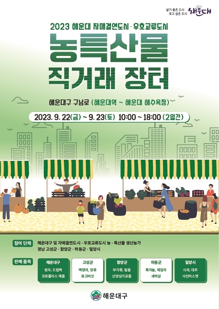 부산 해운대구가 오는 22일부터 23일까지 양일간 구남로에서 ‘자매결연도시·우호교류도시 농·특산물 직거래장터’를 개최한다.