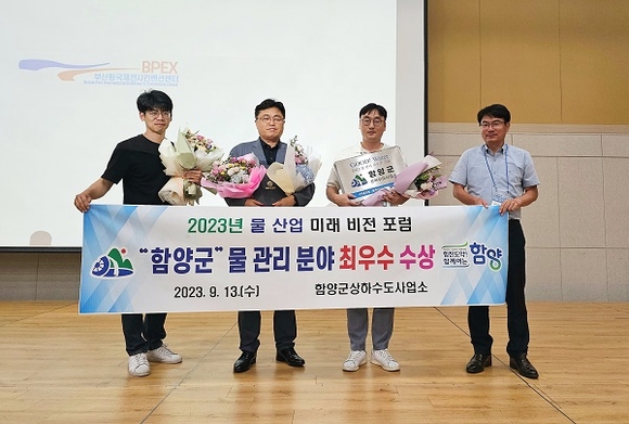 경남 함양군 상하수도사업소는 13일 '물 산업 미래 비전 포럼'에서 물 산업 발전을 위한 상생협력 최우수기관으로 선정돼 '최우수 기관상'을 수상했다.