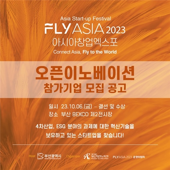 부산테크노파크(TP)가 아시아 창업 엑스포 '플라이 아시아(FLY ASIA) 2023'에서 진행되는 플라이 아시아 오픈 이노베이션에 참여할 기업을 오는 20일까지 모집한다.