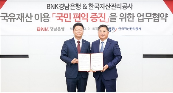 한국자산관리공사(캠코)가 15일 경남은행과 ‘국유재산 이용 국민 편익 증진을 위한 업무협약’을 체결했다고 밝혔다.