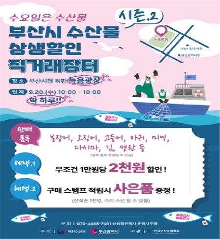 부산시가 20일 오전 10시부터 오후 6시까지 시청 녹음광장에서 ‘추석맞이 수산물 상생할인 직거래장터’를 개최한다고 밝혔다.