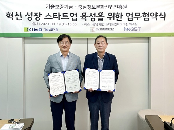 기술보증기금(기보)이 19일 충남정보문화산업진흥원과 충남 스타트업파크에서 ‘혁신성장 스타트업 육성을 위한 충청남도 스타트업파크 지원 업무협약’을 체결했다고 밝혔다.