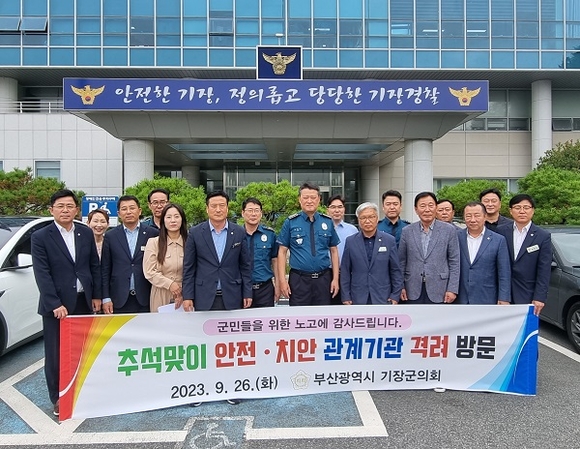 부산 기장군의회가 26일 추석 명절을 앞두고 지역사회의 치안을 보전하고 안전을 지키기 위해 애쓰고 있는 기장경찰서와 기장소방서를 방문해 근무자들을 격려했다.