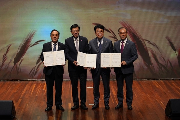(좌측부터) 26일 하윤수 교육감, 박형준 시장, 장제원 의원, 조병길 사상구청장이 ‘자율형 공립고 2.0 및 기숙형 중학교’ 설립 운영에 관한 업무협약을 체결하고 기념촬영을 하고 있다.(사진=부산시교육청 제공)