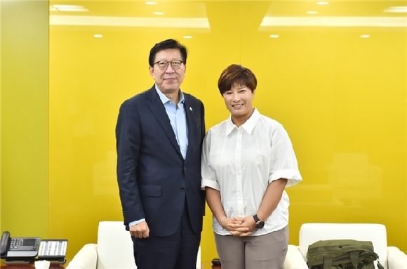 8월 29일 박형준 시장(좌측)이 바즈인터내셔널 박세리 공동대표와 접견 후 기념촬영을 하고 있다.(사진=부산시 제공)