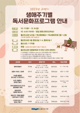 울산도서관은 오는 10월 17일부터 12월 8일까지 ‘2023년 하반기 생애주기별 독서문화프로그램’을 운영한다고 3일 밝혔다.