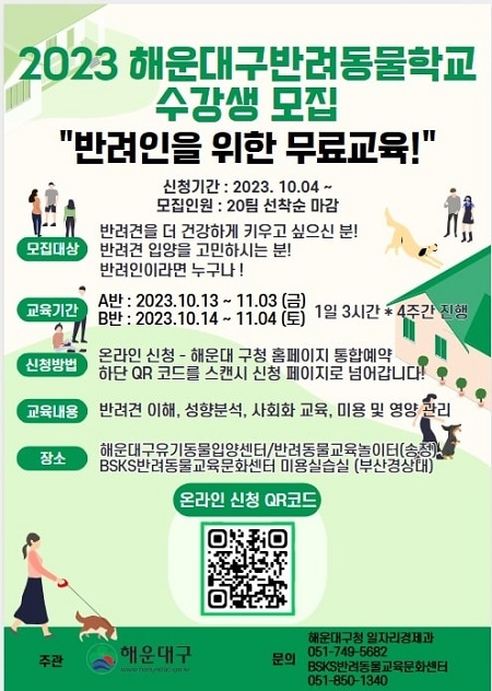 구는 지난해 반려동물학교의 인기에 힘입어 올해는 수강생을 두 배로 늘렸으며 반별 20팀씩 총 40팀을 선착순 모집한다. 참여를 원하는 주민은 해운대구청 홈페이지 통합예약(반려동물학교)에서 신청하면 된다.