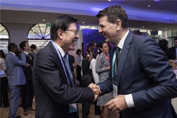 박형준 시장(좌측)이 국제박람회기구 회원국 주요인사들을 만나 교섭활동을 하고 있다.(사진=부산시 제공)