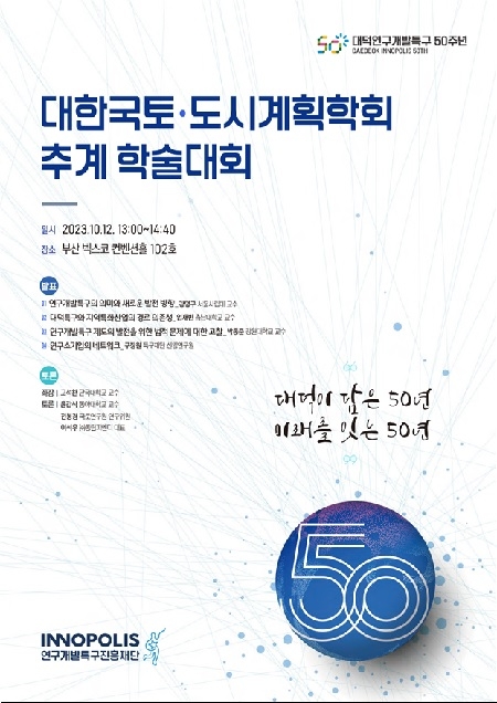 연구개발특구진흥재단이 올해 대덕특구 50주년을 기념해 국가적 R&D 혁신클러스터인 대덕특구의 역사·성과 및 향후 발전방안을 논의하기 위해 11일부터 12일까지 양일간 벡스코에서 개최되는 대한국토·도시계획학회 추계 학술대회에서 ‘대덕특구 50주년 특별세션’을 개최 한다고 밝혔다.