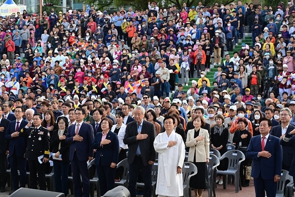 이날 행사는 칠암동 남강야외무대에서 조규일 시장과 국회의원, 도의원, 시의원, 국제교류도시와 남중권도시 관계자 등 주요 내빈, 그리고 2500여 명의 시민이 참여한 가운데 개최됐으며, 블랙이글스의 축하비행과 시립국악관현악단 공연, 진주가 낳은 트로트 신동 가수 빈예서, 코러스댄스팀 공연 등 식전행사로 시작됐다.