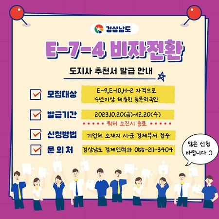 E-7-4 비자 전환 발급 신청은 외국인 본인이 법무부 민원서비스 누리집 하이코리아에서 신청하면 된다. 도지사 추천서가 필요한 대상자는 20일부터 오는 12월 20일까지 시군 담당부서를 통해 업체 소재지 시청·군청 누리집에서 인터넷으로 신청하거나 방문하여 신청하면 된다.