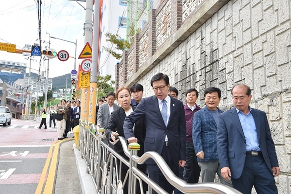 19일 박형준 시장이 청동초등학교 통학로 현장을 점검하고 있다.(사진=부산시 제공)