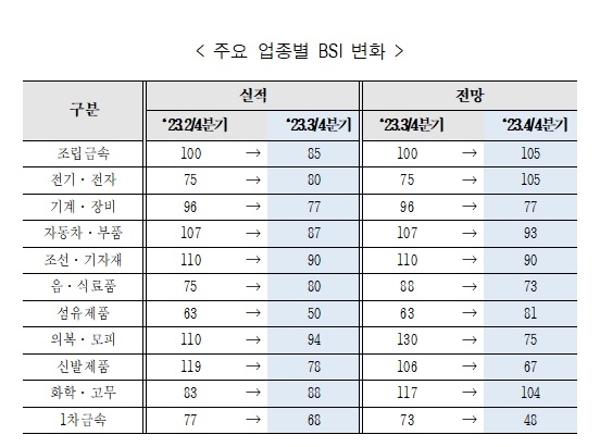 업종별로는 경기침체에 따른 전ㆍ후방산업 위축, 철강 등 원자재 및 에너지가격 상승으로 부담이 증가한 1차금속(48)이 기준치(100)를 크게 하회한 가운데 신발(67), 의복․모피(75), 섬유(81) 업종에서 소비재 수요 감소의 영향으로 부진한 모습을 보였다.