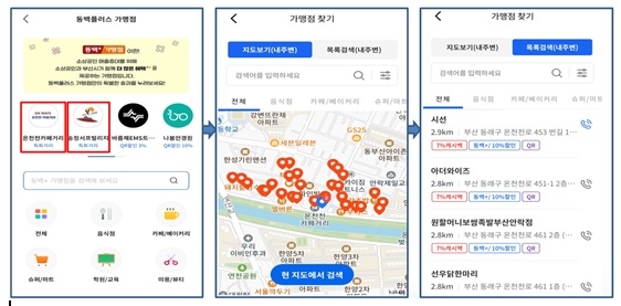 특화거리 가맹점과 상세혜택은 동백전 동백플러스 화면에서 온천천카페거리 또는 송정서프빌리지 아이콘을 클릭하거나 해당 장소 방문 후 지도보기를 통해서도 확인할 수 있다.