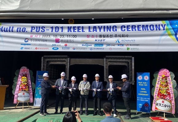 지난 23일 특구과제 첫 번째 실증인 ‘암모니아 기반 연료전지 하이브리드 친환경 선박 실증’ 참여기업 동일조선에서 건조중인 선박의 용골거치식(KEEL LAYING CEREMONY)을 개최했다.