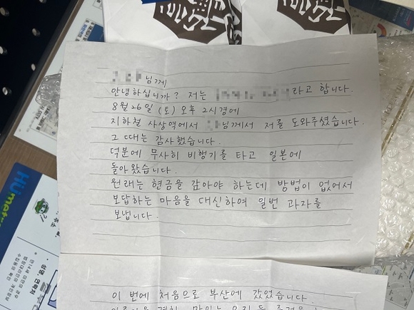 한글로 쓰인 A씨의 자필 편지를 읽은 사상역 직원들은 “낯선 타지에서 비행기를 놓칠까 노심초사하던 승객을 당연히 도운 것뿐인데 잊지 않고 소식을 보내주셔서 오히려 감사하고 뭉클하다”고 전했다.