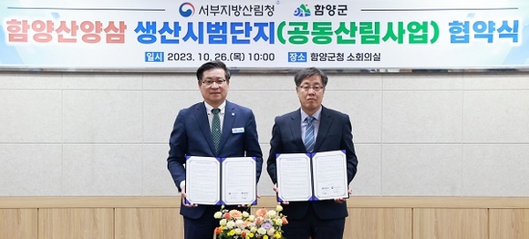 경남 함양군은 26일 오전 군청 소회의실에서 서부지방산림청과 '함양 산양삼 생산시범단지 공동산림사업' 업무협약을 체결했다.
