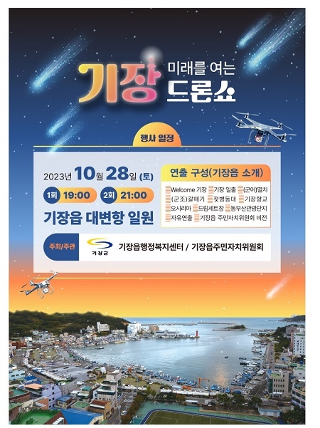 부산 기장군이 오는 28일 기장읍 용암초등학교 및 대변항 일원에서 기장읍주민자치위원회 주관으로 ‘2023년 기장 나눔프리마켓’과 ‘미래를 여는 드론쇼’를 처음 펼친다.