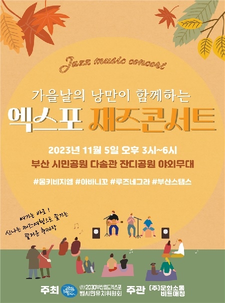 2030부산월드엑스포범시민유치위원회가 다음달 5일 오후 15시 부산시민공원 다솜광장에서 2030부산세계박람회 유치 기원, 시민과 함께하는 `가을날의 낭만, 엑스포 재즈콘서트`를 개최한다고 밝혔다.