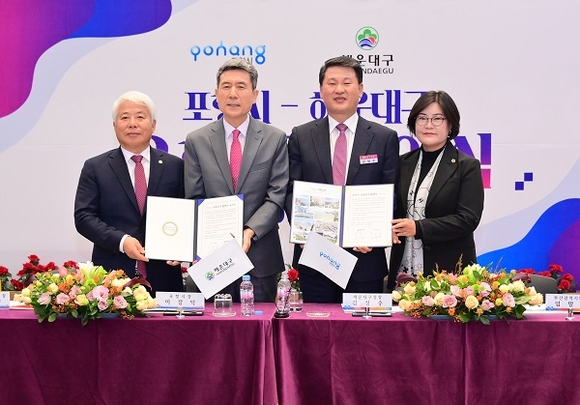 부산 해운대구가 지난 27일 포항시청 대회의실에서 경상북도 포항시와 우호도시 결연 협약을 체결했다.