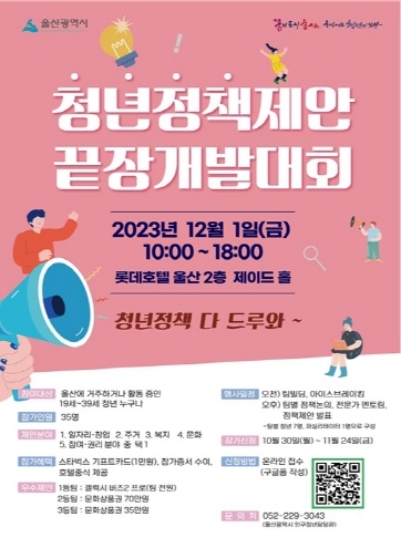 울산시는 오는 12월 1일 롯데호텔에서 개최되는 ‘청년정책 제안 끝장개발대회’ 참가자를 모집한다고 30일 밝혔다.