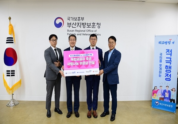 부산신용보증재단과 민주노총 전국공공운수사회서비스노동조합 부산신용보증재단지부가 지난 30일 부산지방보훈청, 사랑의열매와 함께 지정기탁금 200만원을 전달하는 기념식을 가졌다.